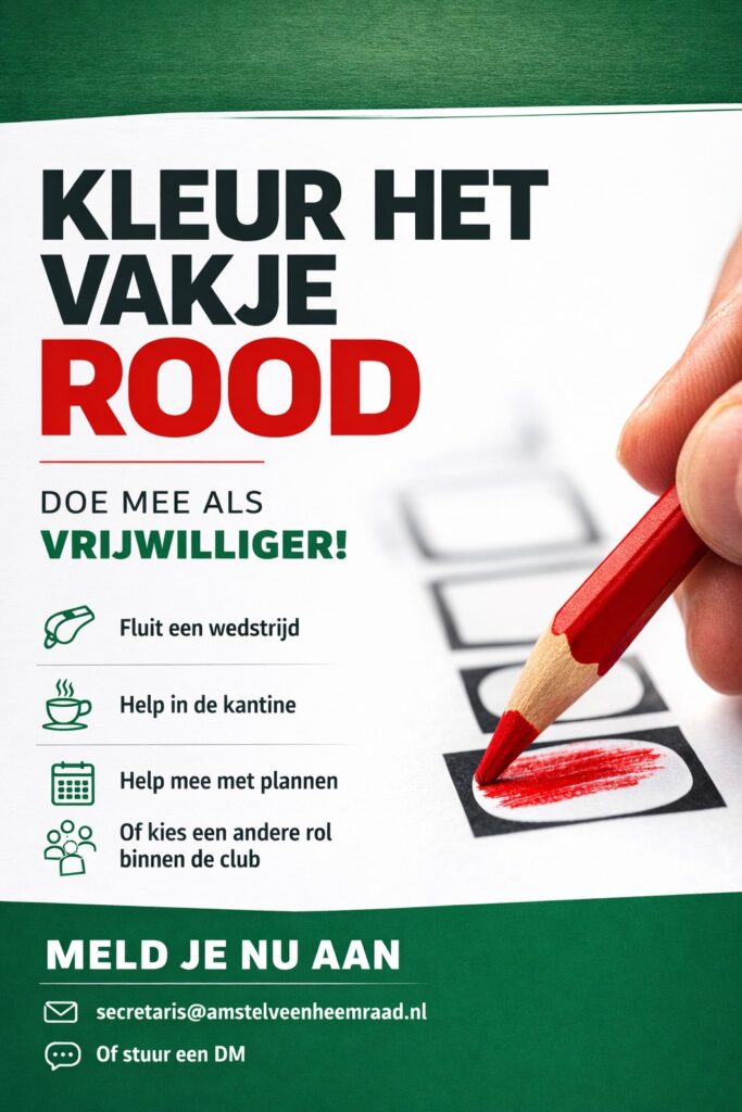 Of je nu helpt in de kantine, af en toe een wedstrijd wil fluiten, de scheidsrechters indeelt voor wedstrijden, wedstrijden organiseert als wedstrijdsecretaris of achter de schermen ondersteunt — jouw inzet telt. Je leert nieuwe mensen kennen, draagt bij aan een fijne sfeer en zorgt ervoor dat onze club blijft groeien en bloeien.
