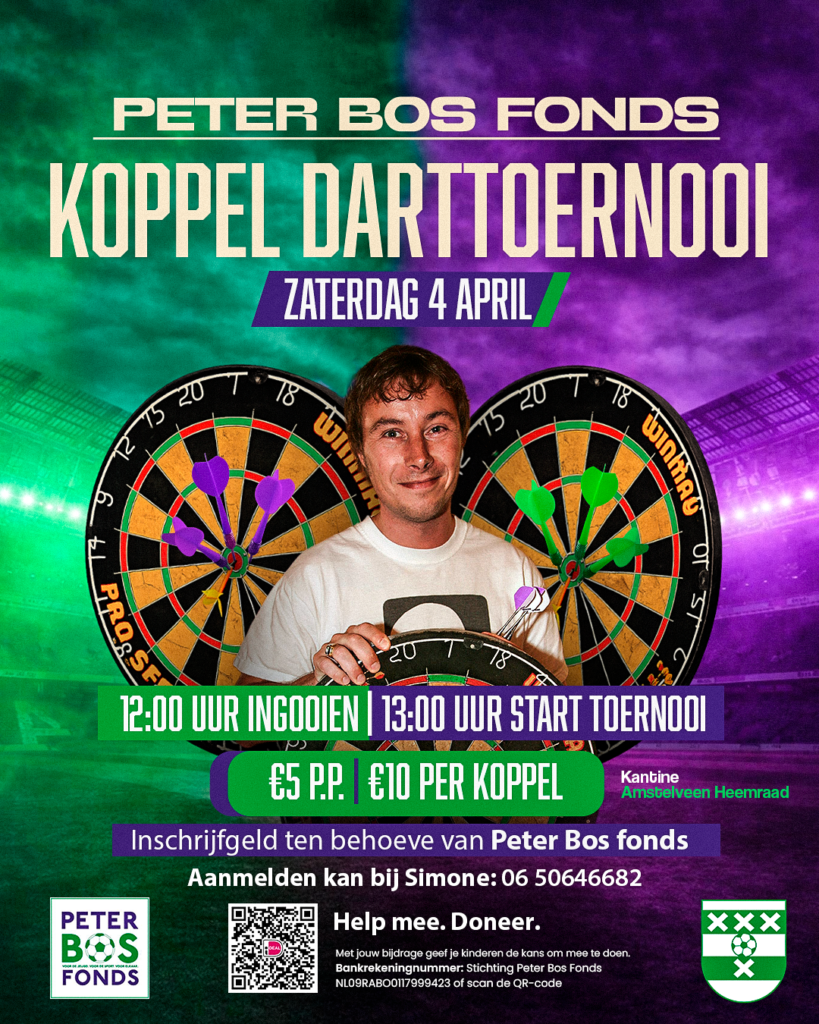 Samen met het Peter Bos Fonds organiseren we op zaterdag 4 april een Koppel darttoernooi. Ingooien vanaf 12:00 en vanaf 13:00 start het toernooi.
